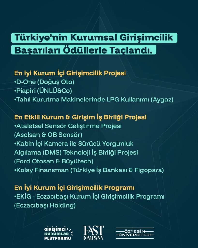 Girişimci Kurumlar Platformu (GKP) ve Özyeğin Üniversitesi iş birliğinde, bu yıl yedincisi düzenlenen Kurumsal Girişimcilik Ödülleri’nde (KİG Ödülleri) kazananlar, 26 Kasım Çarşamba günü Fast Company Türkiye tarafından gerçekleştirilen Corporate & Startup Day’de açıklandı.